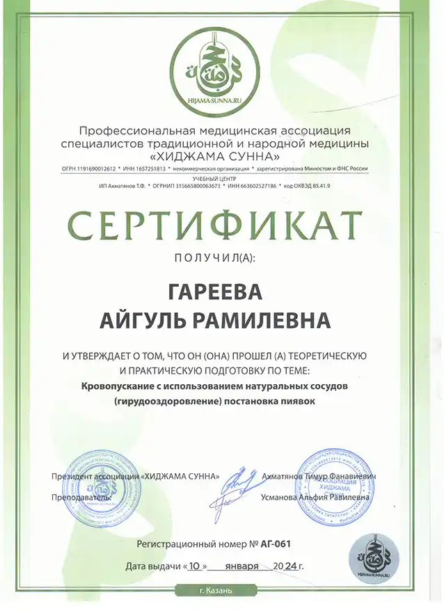 Гирудо-практика — это оздоровление сертифицированными пиявками для улучшения самочувствия и омоложения. Пиявки в Нефтеюганске доступны в кабинете Айгуль Ханум. Курс составляет 5–10 сеансов по 45–90 минут. Все пиявки сертифицированные, используются однократно.